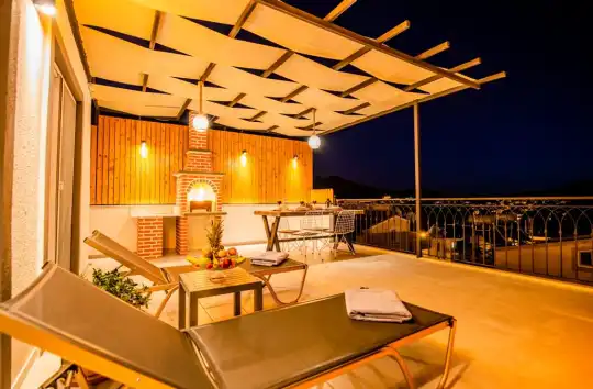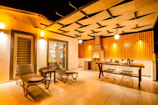 Benli suit apart, terasımızda jakuzi, yemek masası ve sandalyeleri, mangal, şezlong ve güneşlenme şemsiyesi, oturma grubu ve pergole bulunmaktadır.