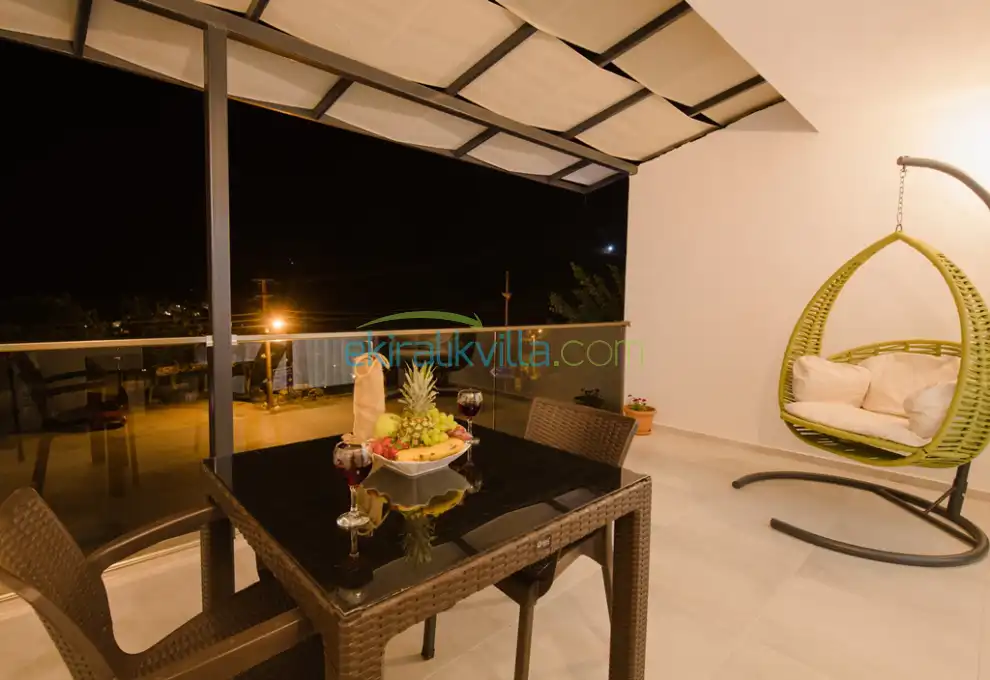 Kalkan günlük kiralik apartımızın teras katında yemek masası, salıncak, mangal mevcut olup deniz manzaralıya karşı kusursuz bir şekilde keyifle vakit geçirebilirsiniz.