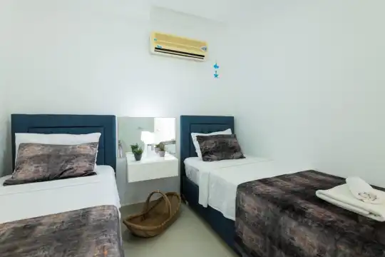2. Yatak odası : 2 adet tek kişilik yatak, elbise dolabı, saç kurutma makinası, klima, balkon, salon kısmındaki ortak kullanım banyo ve tuvalet vardır.
