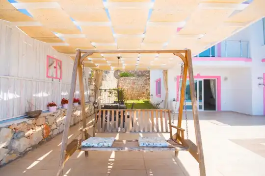 Villa Akbel Pinky Kalkan geniş bahçesi ve havuz terası ile siz misafirlerimizin rahatlığı için havuz terasımızda ve bahçemizde şezlong, güneşlenme şemsiyesi, dinlenme köşkü, salıncak, mangal, yemek masası ve sandalyeleri bulunmaktadır.