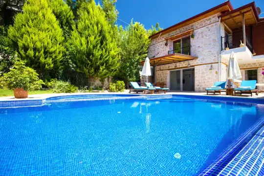 İslamlar kiralık balayı villamızın özel yüzme havuzu korunaklı olup, dışarıdan kesinlikle gözükmemektedir ve bu sebeple dolayı Villa Muar muhafazakar villa tatili isteyen aile ve balayı çiftlerimiz için oldukça ideal bir islamlar jakuzili kiralık helal villa seçeneklerimizden en çok tercih edilen villalarımızdan birtanesi olup en yakın market sadece 2 dakika araba ile veya 10 dakika yürüyüş mesafesinde olduğu için misafirlerimiz tarafından tercih edilen Kalkan muhafazakar korunaklı villalarımızdandır.