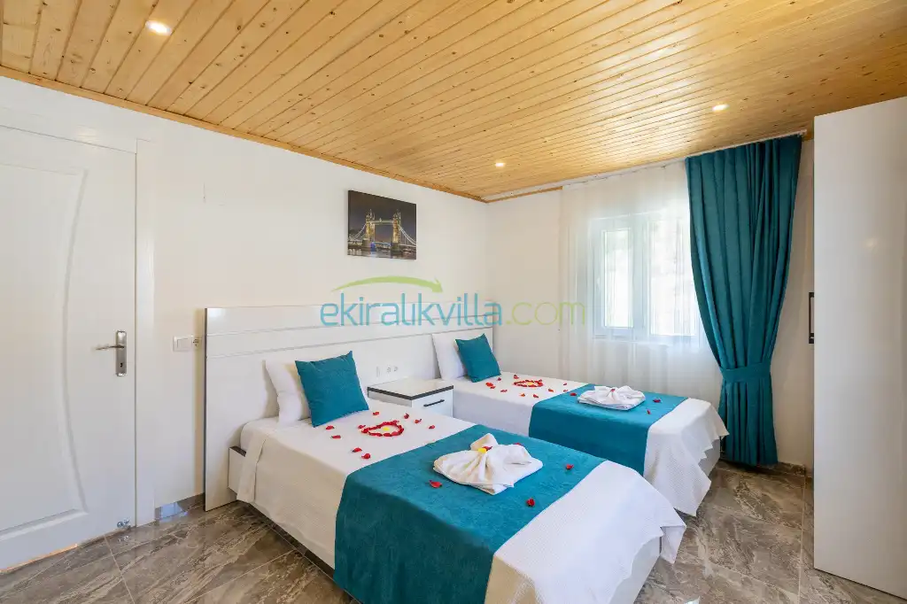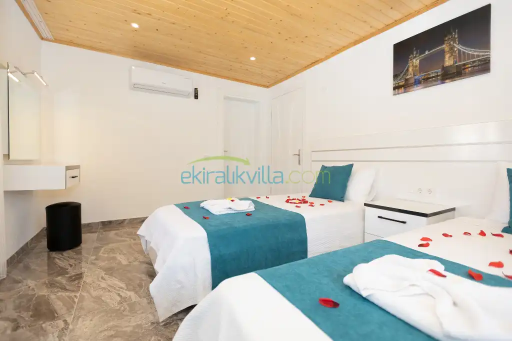 2. Yatak odası: 2 adet tek kişilik yatak, elbise dolabı, saç kurutma makinası, klima, balkon, banyo ve tuvalet vardır.