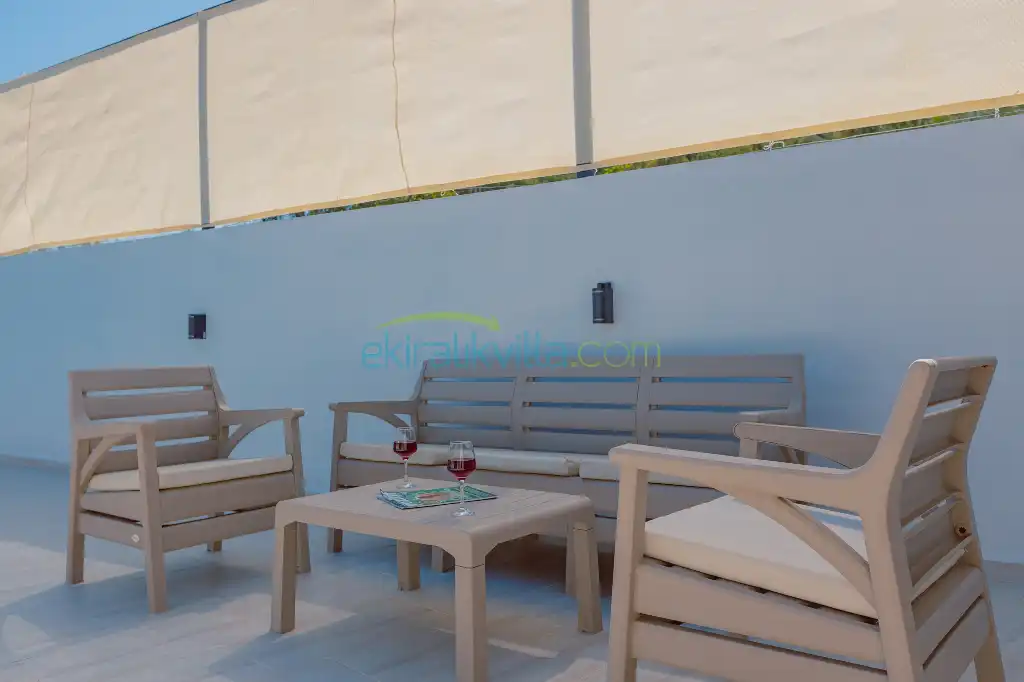 Kalkan Villa Adalya İkizce geniş bahçesi ve havuz terası ile siz misafirlerimizin rahatlığı için havuz terasımızda ve bahçemizde şezlong, güneşlenme şemsiyesi, barbekü, yemek masası ve sandalyeleri ve oturma grubu bulunmaktadır.