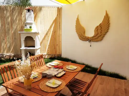 Villa Akbel Tita, Kalkan geniş bahçesi ve havuz terası ile siz misafirlerimizin rahatlığı için havuz terasımızda ve bahçemizde şezlong, güneşlenme şemsiyesi, mangal, yemek masası ve sandalyeleri bulunmaktadır.