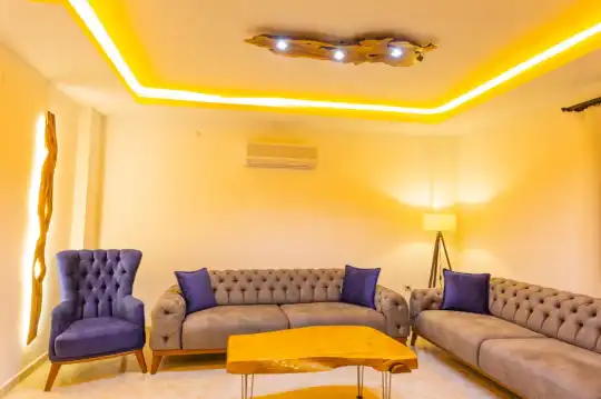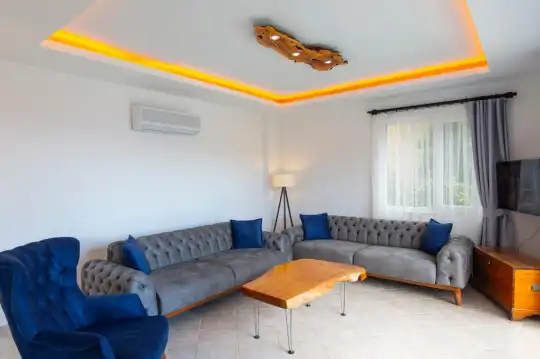 Salonumuzda rahat, modern, lüks oturma grubu, tv ve uydu alıcısı, ütü masası, limitsiz kablosuz internet, havuz kıyısına ve bahçeye çıkış vardır.