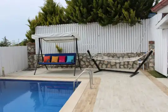 İslamlar Günlük Kiralik Villamız havuz terasında büyük havuz şezlong, şemsiye, mangalı, hamak, çocuk havuzu, açık ve kapalı havuzu, salıncak, 4 kişilik masa vb. gibi manzaraya karşı yorgunluğu giderilmesi için balayı çiftlere düşünülmüş korunaklı villamızdır.