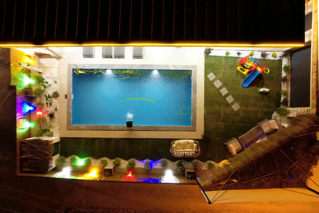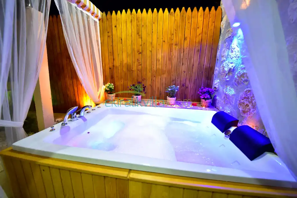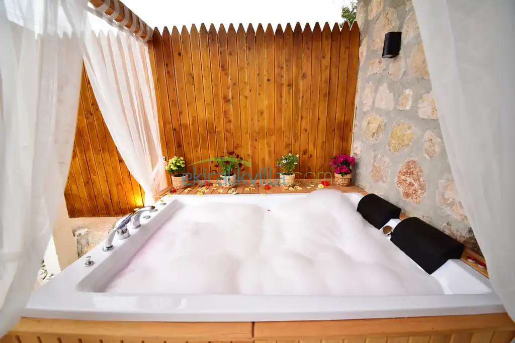 Kalkan kiralık villa’mızın havuz etrafı dışarıdan gözükmemektedir, bu nedenle muhafazakar tatil isteyen aileler veya muhafazakar balayı çiftleri için dış gözlerden uzak, sessiz ve sakin bir kiralık villada tatili amaçlayan tatilcilerimize uygundur.Havuz terasın jakuzisi, langırt, çocuk oyun alanı vardır.