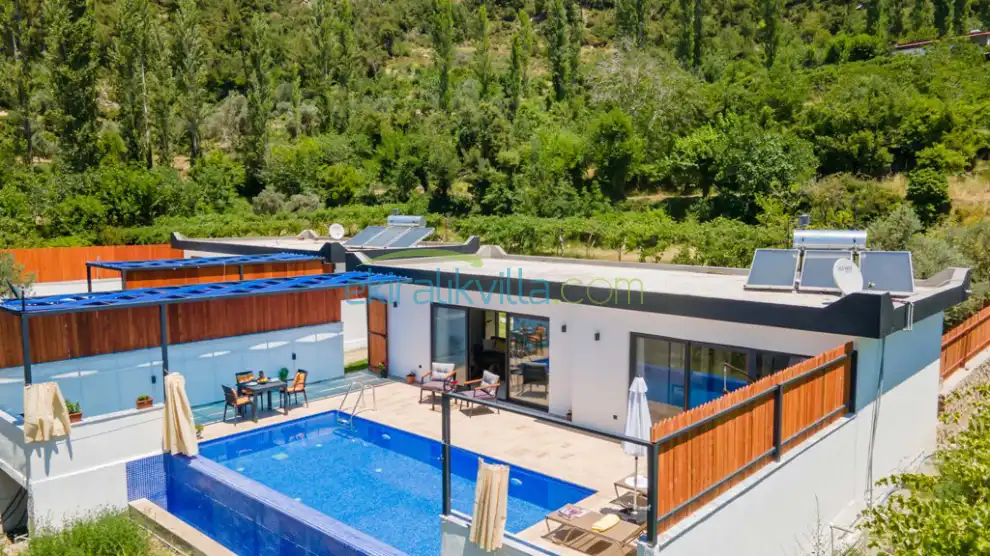 Muhteşem doğa ve yeşillikle içerisinde eşsiz bir konumda bulunan islamlar yazlık balayı kiralık villamızın havuzu dışarıdan gözükmemektedir.
