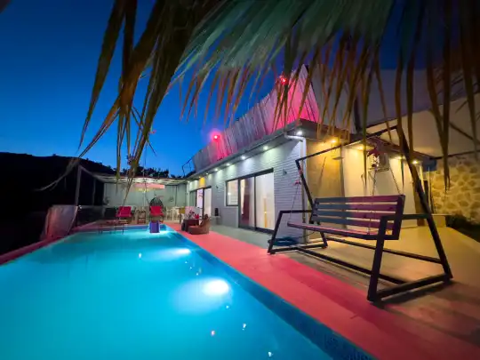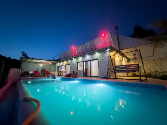 Üzümlü Kiralık Balayı Villamızın Özel Yüzme Havuzu korunaklı olup, dışarıdan kesinlikle gözükmemektedir ve bu sebeple dolayı Villa Ayışığı Lapaz muhafazakar villa tatili isteyen balayı çiftlerimiz için oldukça ideal bir Üzümlü jakuzili kiralık villalarımızdan bir tanesi olup en yakın market sadece 10 dakika araba ile sürüş mesafesinde olduğu için misafirlerimiz tarafından tercih edilen Kalkan muhafazakar korunaklı villalarımızdandır.
