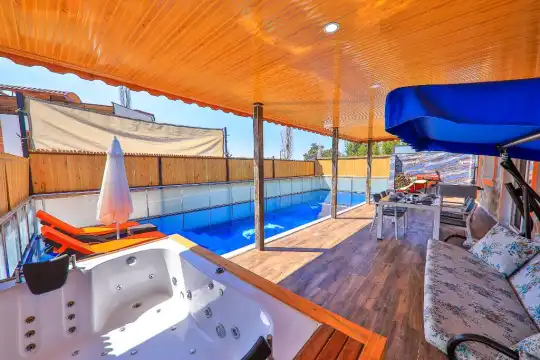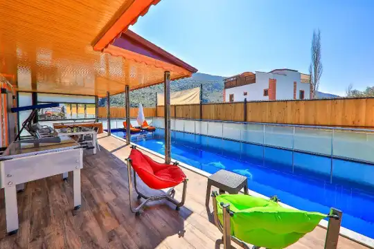 Mutaassıp aile villası, Balayı villası, Modern iç tasarım, Lüks kiralık villa, Jakuzili villa, Kalkan kiralık villa, Langırt oyunu olan villa, Havuzu ısıtmalı balayı villası.