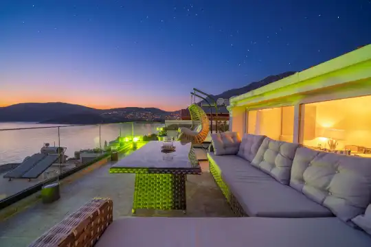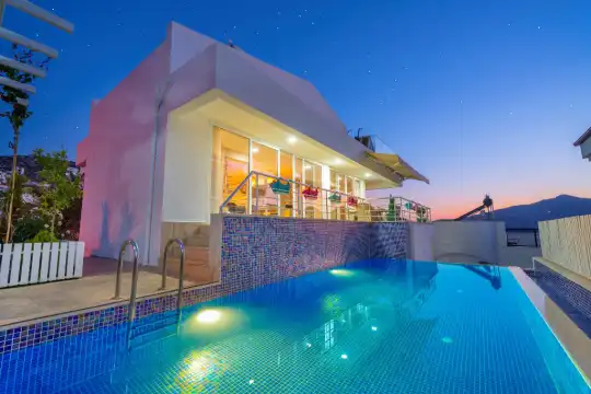 Panoramik kalkan ve deniz manzaralı, Geniş aile villası, Modern ve lüks iç ve dış dekorasyon, Müstakil kiralık villa, Denize yürüyüş mesafesinde olan yazlık, Özel yüzme havuzlu kiralik villa.
