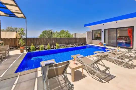 Kalkan günlük kiralık villa can can 2 yatak odalı, 4 kişilik, korunaklı özel yüzme havuzu, havuz içi merdiven, geniş havuz terası ve muhteşem doğa ve uzaktan az derecede deniz manzarası, geniş odaları, oda içi jakuzisi gibi özelliklere sahip olup muhafazakar tatil yapmak isteyen aileler ve balayı çiftleri için ideal seçeneklerimizden bir tanesidir.