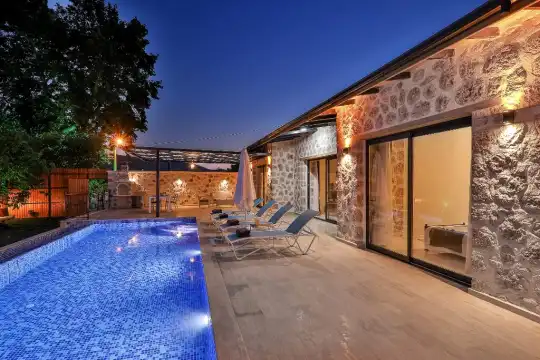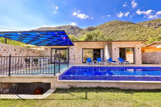 Villa Çınar, Kalkan Hacıoğlan mevkiisinde konumlanmış olan, 4 Kişilik 2 yatak odalı, taş ve ahşap mimari ile yapılmış olup, panoramik doğa içerisinde bulunan villamız, özel yüzme havuzlu, jakuzili havuz, hamak, oda içerisinde jakuzi, yeşillik alanı, lüks, konforlu ve modern tasarımı, özgüvenli ve muhafazakar tatil evimizi sizlere hizmetinize sunmaktayız.