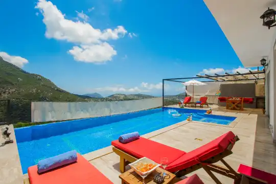 Villa Dimare Kalkan eşsiz bir konumda, muhteşem dağ ve deniz manzaralı huzurlu ortama sahiptir. Havuz terasımızda ve bahçemizde şezlong, güneşlenme şemsiyesi, barbekü, yemek masası ve sandalyeleri, oturma grubu vardır.