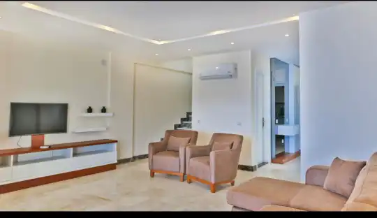 Salonumuzda rahat, modern, lüks oturma gurubu, tv ve uydu alıcısı, ütü masası, limitsiz kablosuz internet, havuz kıyısına ve bahçeye çıkış vardır.