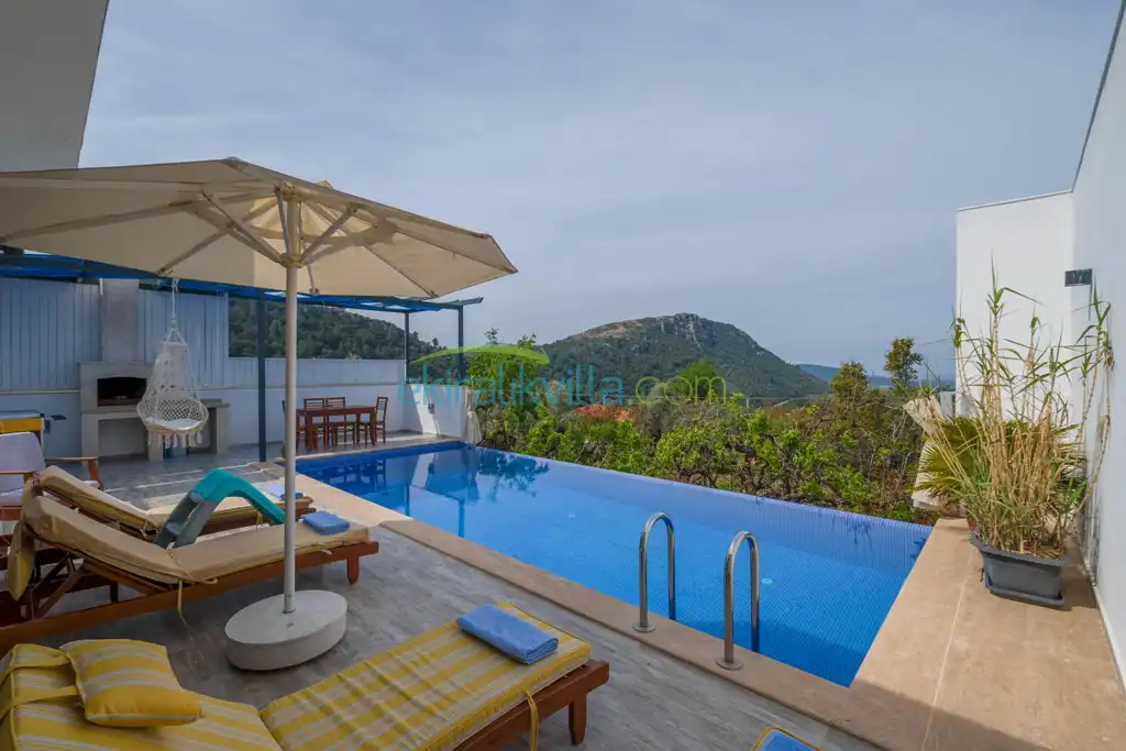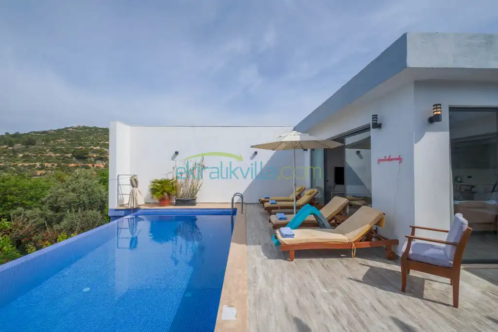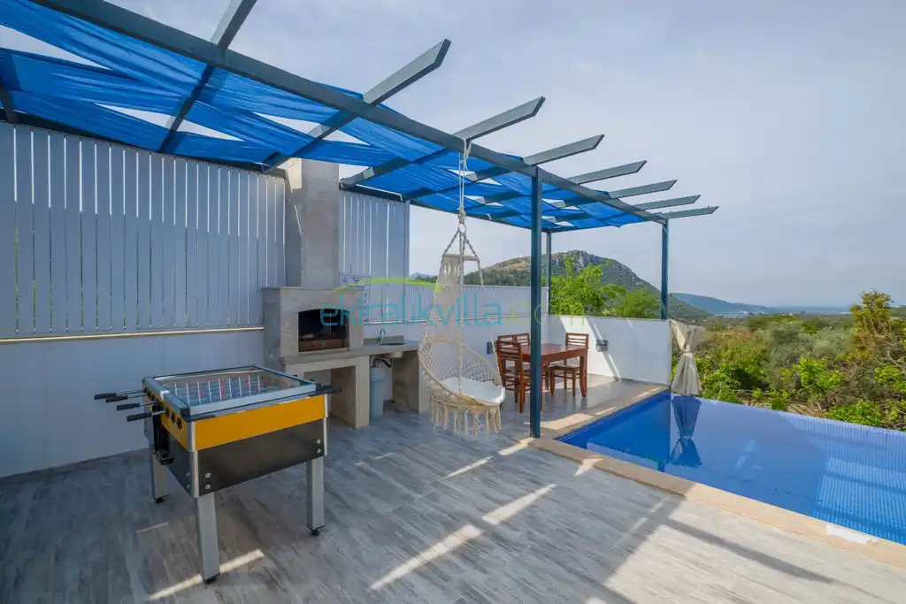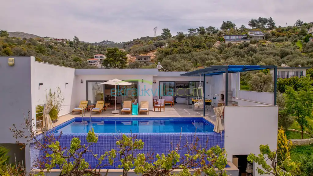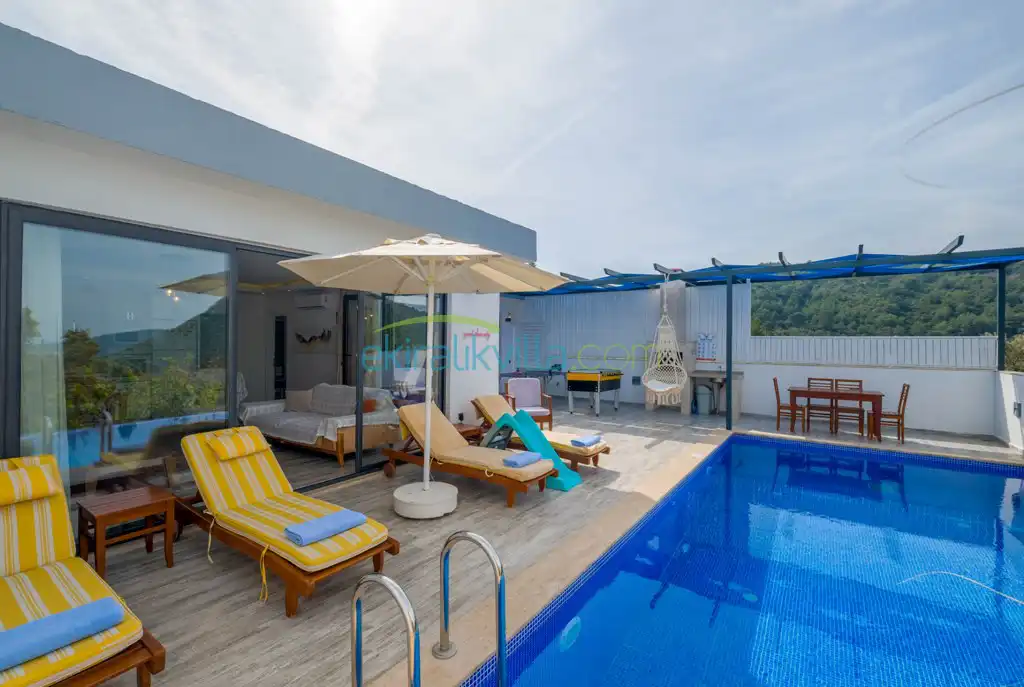 Villa Esin Kalkan Üzümlü Köyün'de bulunan Havuzu Korunaklı Muhafazakar Balayı Villası. Villa Esin doğa ve yeşillik manzarası, havuz terasında jakuzisi, salıncak,mini masa tenisi,Langırt,çocuk kaydırağı modern eşyaları ile yeşillikler arasında hoş bir elit tatil isteyen balayı çiftleri için mükemmel kalkan günlük kiralık villamızdır.