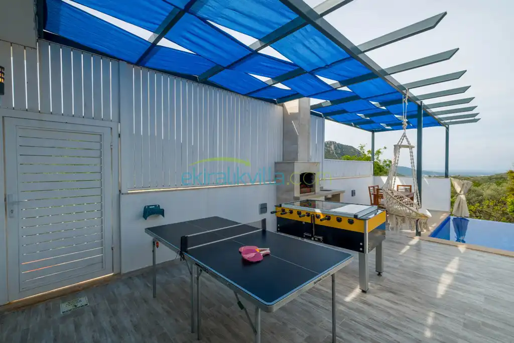 Villa Esin güzel, geniş bir bahçeye ve manzaraya sahiptir. Havuz terasımızda ve bahçemizde müşterilerimiz için barbekü, özel salıncak, şezlong, güneşlenme şemsiyesi, Mini masa tenisi, Langırt,Çocuk kaydırağı yemek masası ve sandalyeleri, oturma grubu bulunmaktadır.