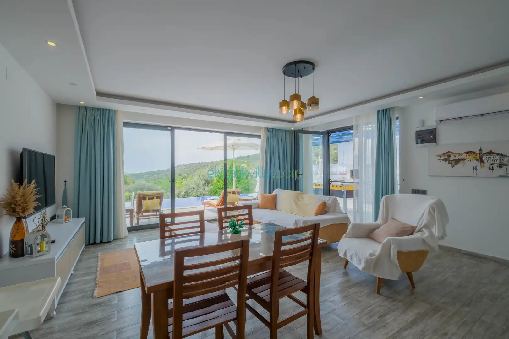 Salonumuzda rahat, modern, lüks oturma gurubu, tv ve uydu alıcısı, ütü masası, limitsiz kablosuz internet, havuz kıyısına ve bahçeye çıkış vardır.