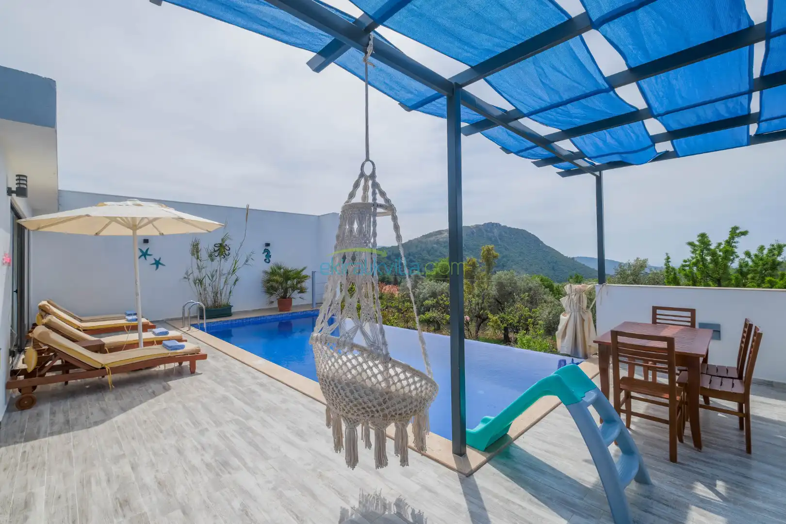 Villa Esra Üzümlü Kalkan Üzümlü Köyün'de bulunan Havuzu Korunaklı Muhafazakar Balayı Villası. Villa Esra Üzümlü doğa ve yeşillik manzarası, havuz terasında jakuzisi, salıncak,mini masa tenisi,Langırt,çocuk kaydırağı modern eşyaları ile yeşillikler arasında hoş bir elit tatil isteyen balayı çiftleri için mükemmel kalkan günlük kiralık villamızdır.