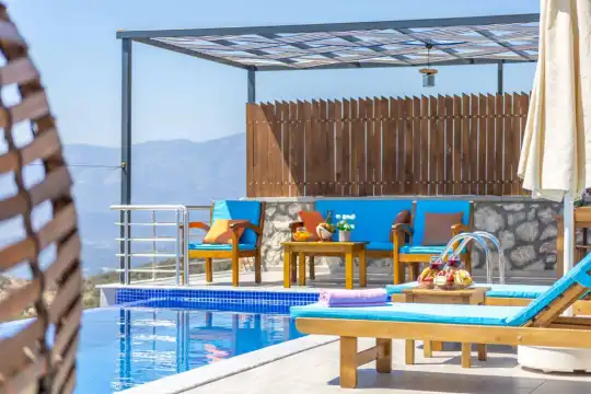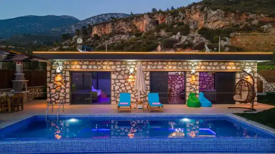 Kalkan Korunaklı Villa, Kalkan Balayı villası, Jakuzili villa, Balayı çiftlerine uygun, Doğa Manzaralı, Kalkan Kiralık Lüks Villa, Villa Günbatımı Çavdır tesettürlü muhafazakar kiralık balayı villası.