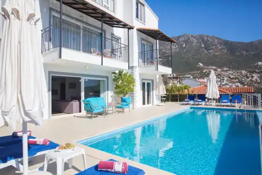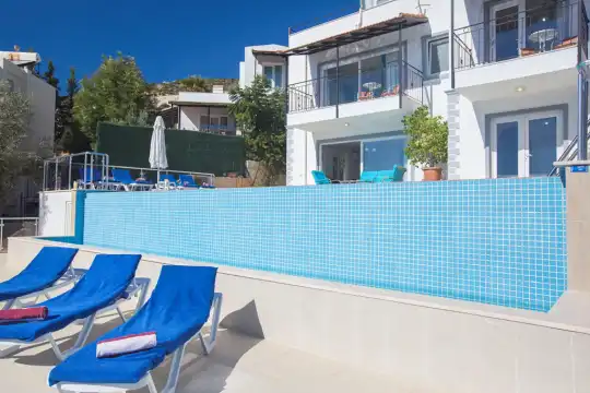 Villa Kalkan Mehtap Kalkan geniş bahçesi ve havuz terası  ile siz misafirlerimizin rahatlığı için havuz terasımızda ve bahçemizde şezlong, güneşlenme şemsiyesi, taştan barbekü, yemek masası ve sandalyeleri ve oturma grubu bulunmaktadır.