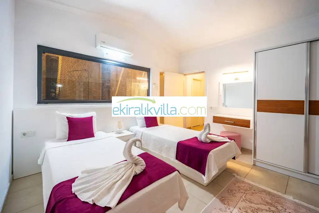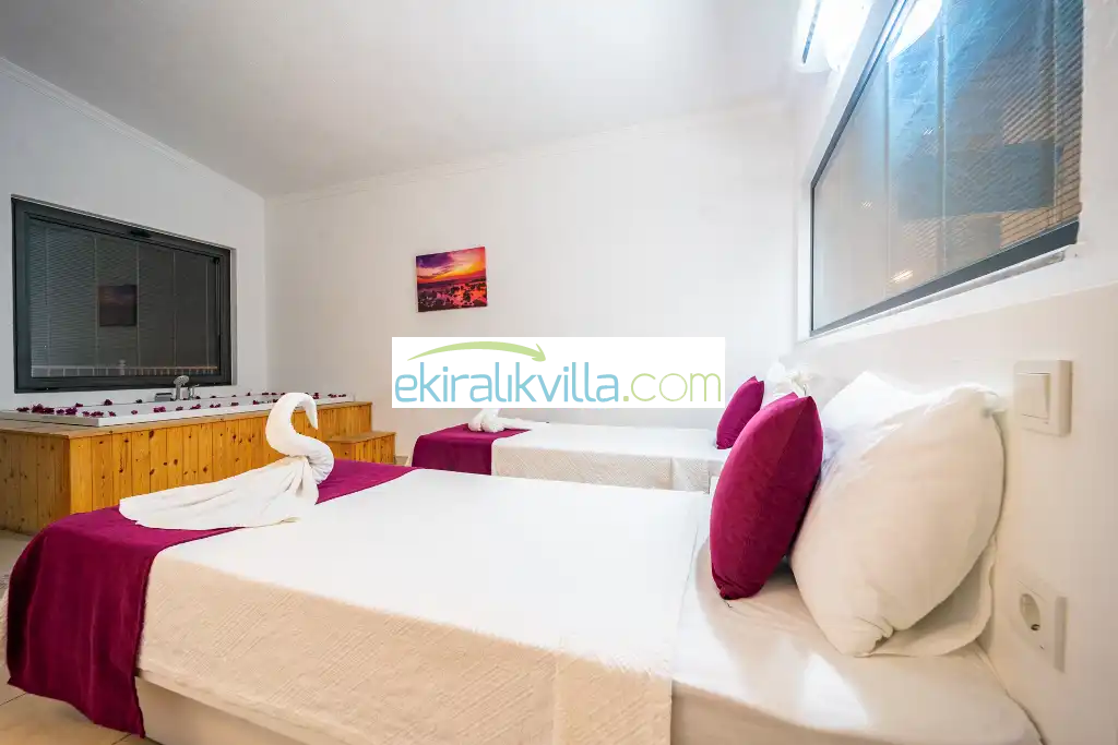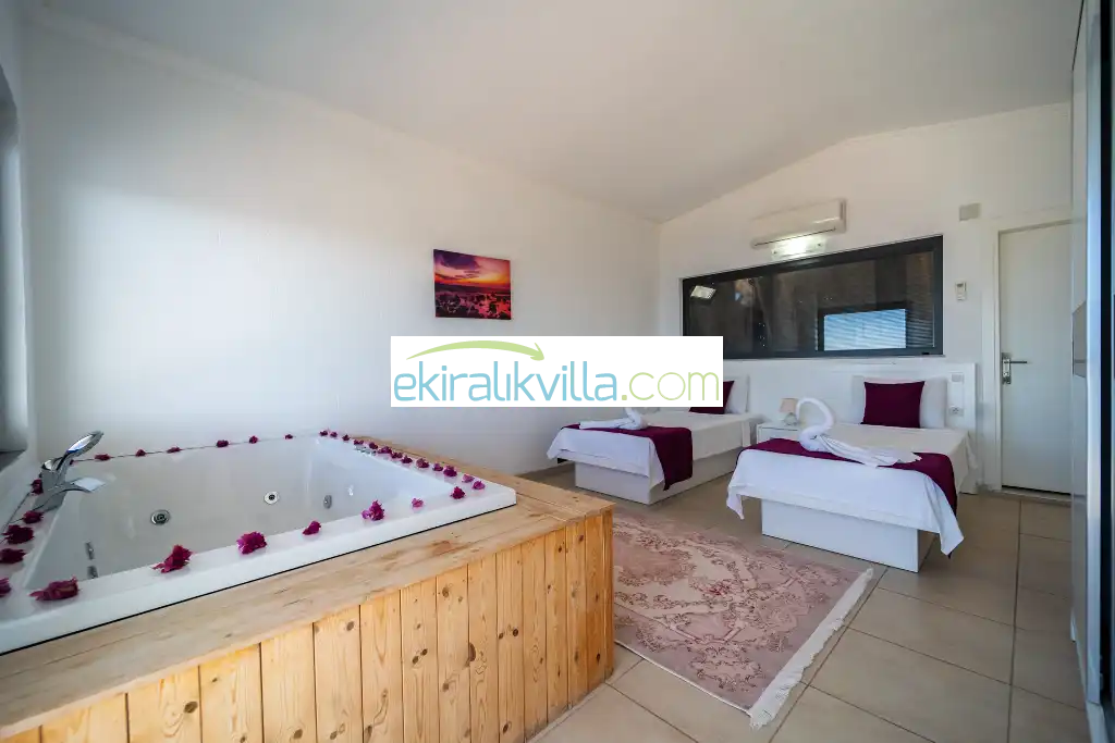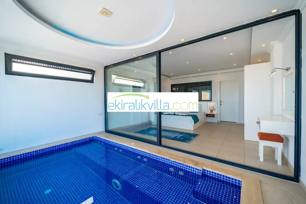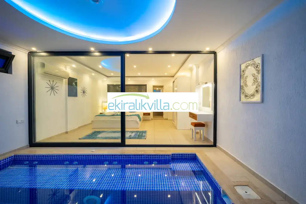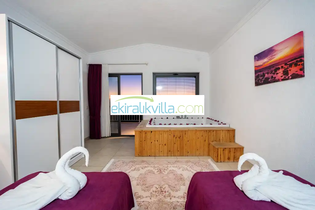 1. Yatak odası : 1 adet çift kişilik yatak, elbise dolabı, saç kurutma makinası, klima, kapalı havuz, banyo ve tuvalet vardır. Bu odamızda iç ısıtma havuzu bulunmaktadır.
