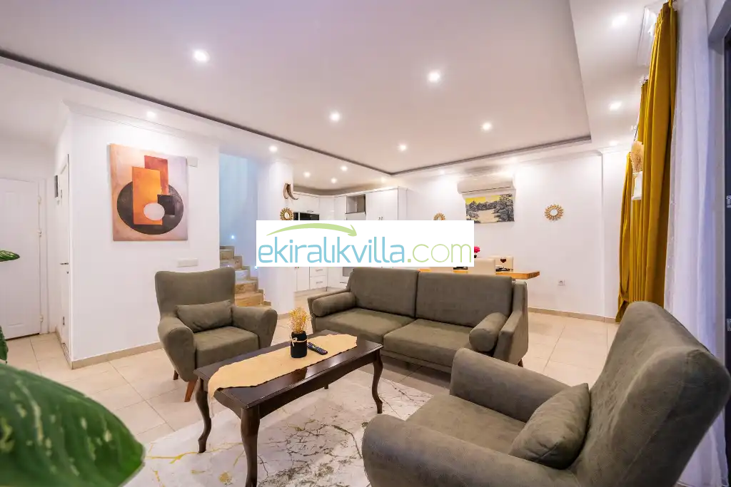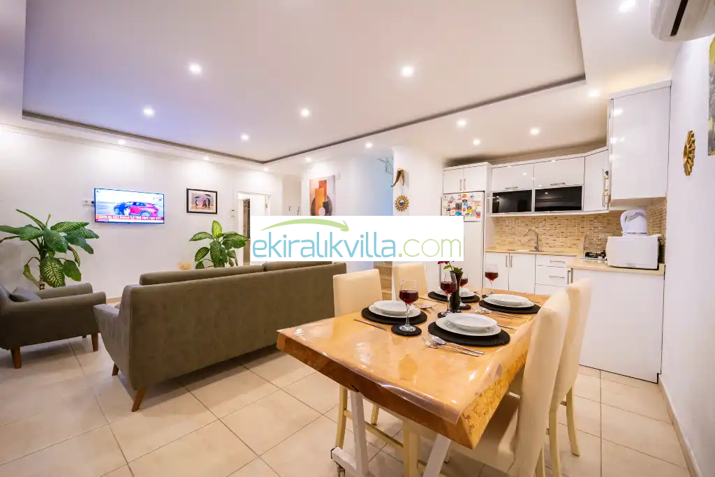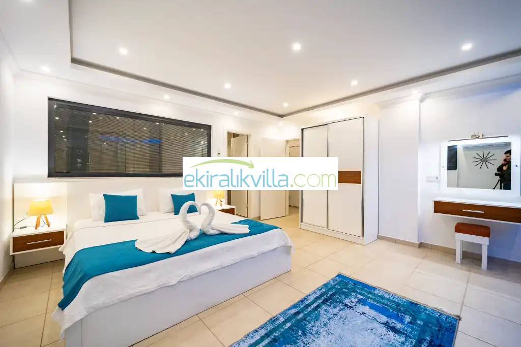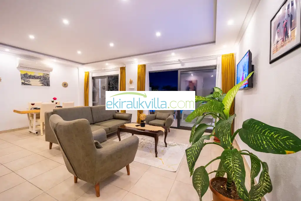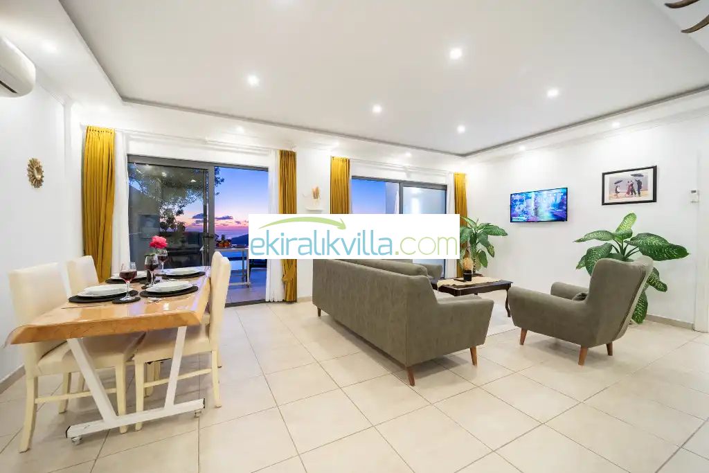 Kalkan günlük kiralık villamızın içerisinde kaliteli, modern ve lüks eşyalar ile özenle dekore edilmiş olup, kalkan yazlık tatil evimiz kalkan merkeze ve denize 10 dk sürüş mesafesinde, market, manav, restorant gibi tesislerede 5 dakika sürüş mesafesinde bulunmaktadır.