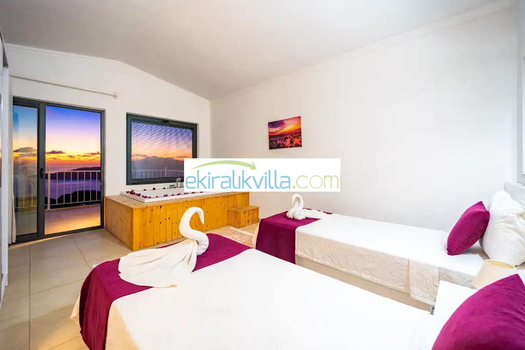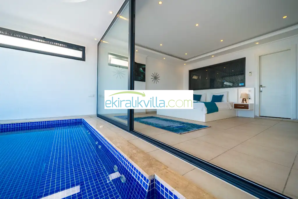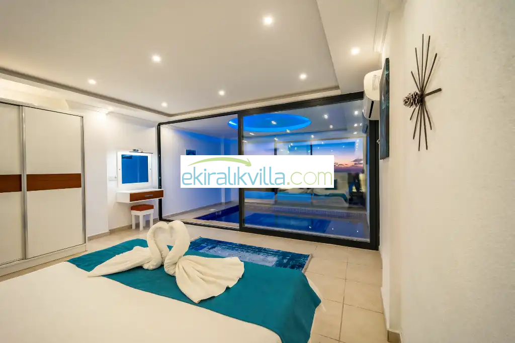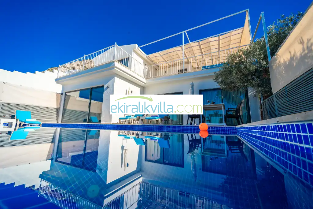 Kalkan Kördere mevkisinde bulunan lüks tatil evimiz 2 yatak odalı, 4 kişi konaklama kapasitesine sahip muhafazakar villa, özel yüzme havuzu, ısıtma havuzu, geniş havuz terası, havuzu korunaklı, havuz terasında barbekü ve kamelya eşliğinde salıncak, yemek masası ile sandalyeleri, güneşlenme şemsiyeleri ve şezlonglar, geniş ve panoramik deniz manzaralı, oda içinde jakuzisi gibi gibi saymakla bitiremeyeceğimiz özelliklere sahip kalkan lüks ve modern villalarımızdandır.
