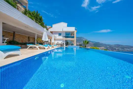 Anılar ile dolu dolu unutamayacağız bir tatil için dünyaca ünlü tatil beldesi olan Kalkan’da siz değerli misafirlerimizin huzurlu, keyifli, hayale uygun bir tatil geçirmesi için tasarlanan Kayra 6 yatak odalı, 12 kişilik konaklama kapasitesine sahip, geniş aile ve arkadaş gruplarına ev sahipliği yapan, lüks dizaynı, modern ve kaliteli eşyaları, özenle yapılmış iç ve dış dekoresiyle sizleri büyüleyecek, panoramik Kalkan denizi, Kalamar koyu ve adalar manzarası eşliğinde sevdiklerinizle unutulmaz hikayeler biriktireceğiniz, bir tanesi özel jakuzili olmak üzere iki kademeli yüzme havuzumuzda kafanızdaki tüm yorgunluğu ve sorunları atarak, kış aylarda havuz ısıtması mevcut olup keyfinizi bozmadan, geniş havuz terasında huzura ve rahata kavuşarak kitap okuyarak dinlenebilir, sevdiklerinizle ve ailenizle hoş yemekler yiyebilir, yine havuz katında bulunan masa tenisi ile zevkli, eğlenceli,güzel vakitler geçirerek her dakikanızda ayrı bir anlam bırakabilirsiniz.