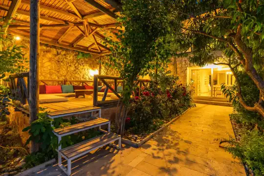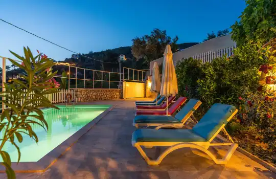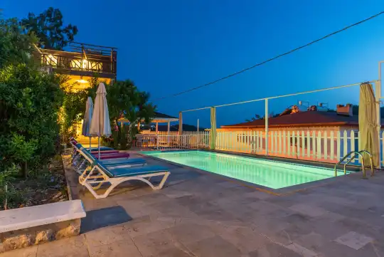 Villa Kelebek, geniş bir bahçeye sahiptir. Villamızın havuz terası gayet geniş olup barbekü, şezlong, güneşlenme şemsiyesi, oturma köşkü, yemek masası, şemsiye ve kamelya yer almaktadır.