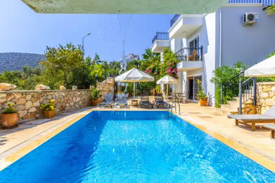 Villa Louise Kalkan geniş bahçesi ve havuz terası ile siz misafirlerimizin rahatlığı için havuz terasımızda ve bahçemizde şezlong, güneşlenme şemsiyesi, barbekü, yemek masası ve sandalyeleri ve girişte oturma köşkü bulunmaktadır.