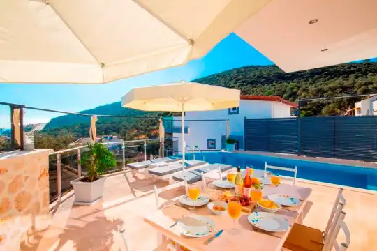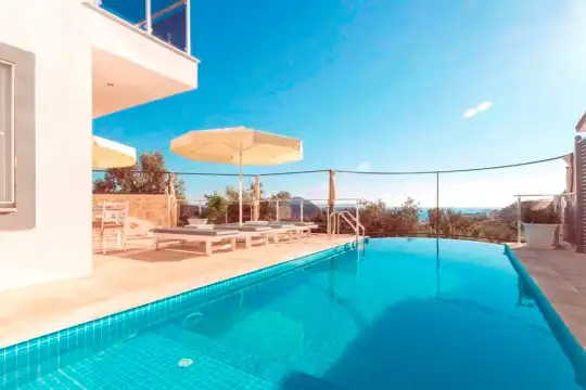Panoramik kalkan ve Deniz Manzaralı, Muhafazakar tatil isteyen aile ve çiftler için uygun, Kaş'da balayı tatili için uygun, Sakin bir konum, Havuzu korunaklı villa, Merkeze yakın konum, Kalkan kiralık villa.