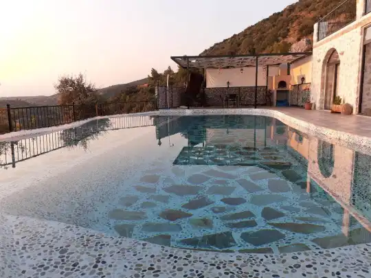 Villa Metehan havuz terası ile siz misafirlerimizin rahatlığı için havuz terasımızda ve bahçemizde şezlong, güneşlenme şemsiyesi, taş barbekü, yemek masası ve sandalyeleri ve oturma grubu bulunmaktadır.