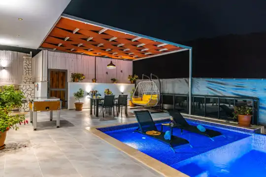 İslamlar Kiralık Balayı Villamızın Özel Yüzme Havuzu korunaklı olup, dışarıdan kesinlikle gözükmemektedir ve bu sebeple dolayı Villa Neon muhafazakar villa tatili isteyen aile ve balayı çiftlerimiz için oldukça ideal bir islamlar Jakuzili Kiralık Helal Villa seçeneklerimizden en çok tercih edilen villalarımızdan bir tanesi olup en yakın market sadece 2 – 3 dakika araba ile mesafesinde olduğu için misafirlerimiz tarafından tercih edilen Kalkan Muhafazakar Korunaklı Villalarımızdandır.