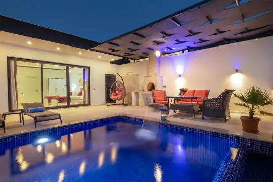 Villamızın 2 yatak odalı 4 kişilik kapasitesine sahip, oda içi Jakuzili, kapalı havuzu, çocuk havuzlu, kobra şelalesi, özel yüzme havuzundan uzaktan Patara Deniz Manzarası ve doğa Manzarasına hakim olan rengine renk katacak lüks balayı villamız sizler için ideal bir tesettürlü balayı çiftleri villası tercih olacaktır.