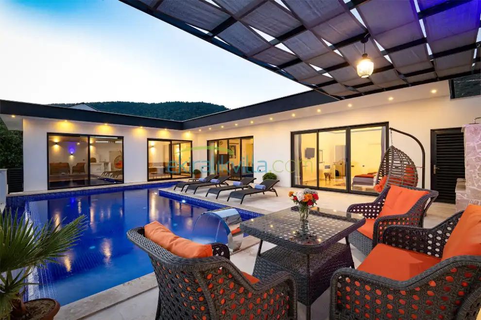 Villa Nur 1 Kalkan geniş bahçesi ve havuz terası ile siz misafirlerimizin rahatlığı için havuz terasımızda şezlong, güneşlenme şemsiyesi, salıncak, yeşillik alanı, yemek masası barbekü ve sandalyeleri ve oturma grubu bulunmaktadır.