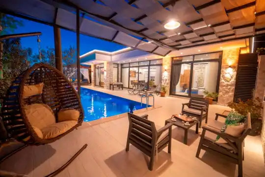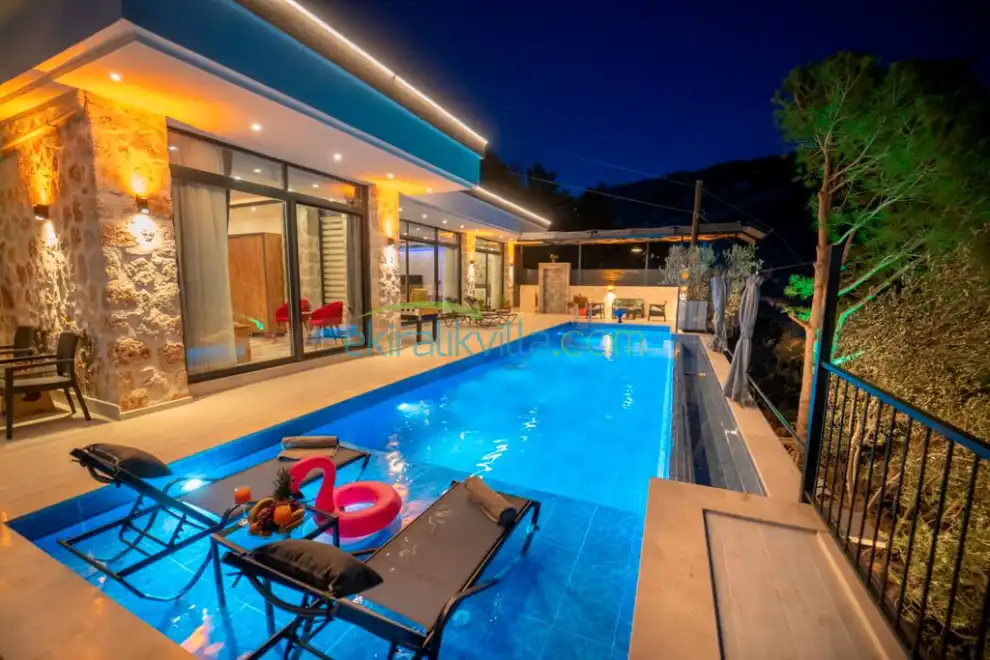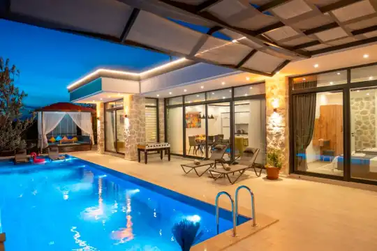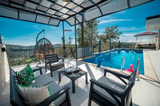 Antalya Kaş İslamlar köyünde 2 yatak odalı, 4 kişilik konaklama kapasitesine sahip olan Villa Oliva, Eşsiz Doğa Manzaralı, oda içerisinde büyük Jakuzili, özel havuzlu, sığ havuzu, salıncak, langırt, tavla, oturma köşkü gibi Havuzu Dışardan Gözükmeyen Muhafazakar Çiftlere Uygun İslamlar Kiralık Muhafazakar Balayı Villamızdır.