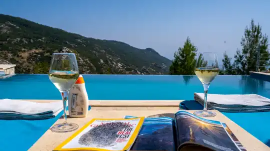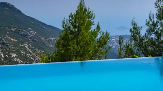 Korunaklı villa, Balayı villası, Modern iç eşya, Lüks kiralık villa, Özel havuzlu villa, Kalkan kiralık villa.