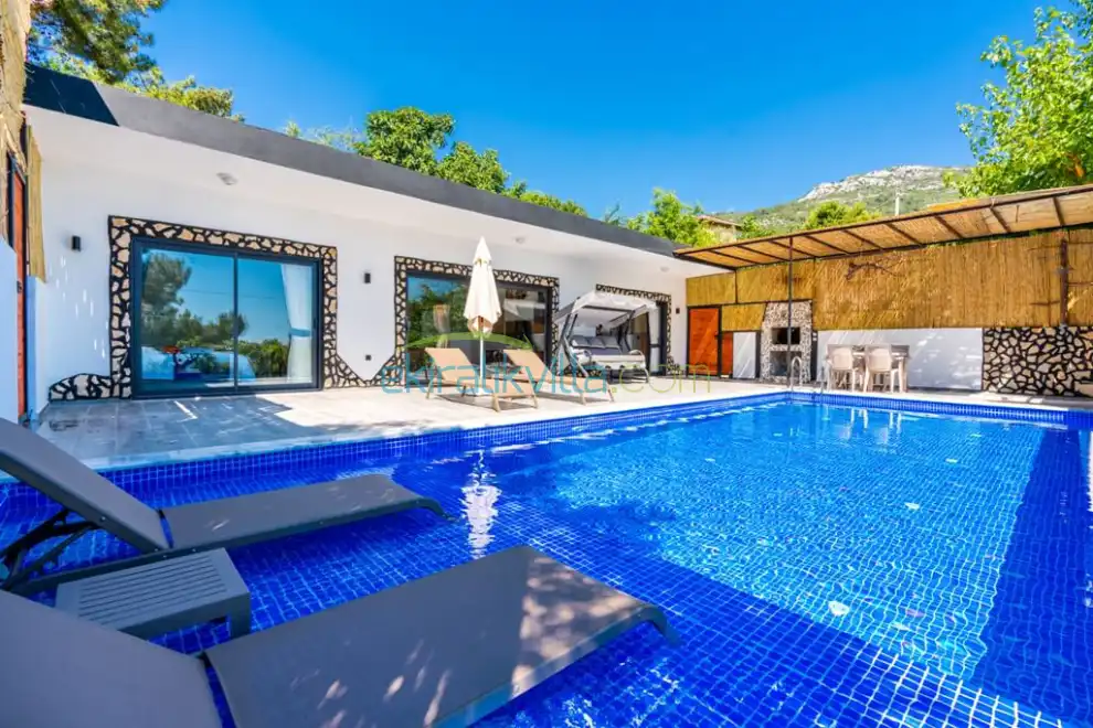 İslamlar Kiralık Balayı Villamızın Özel Yüzme Havuzu korunaklı olup, dışarıdan kesinlikle gözükmemektedir ve bu sebeple dolayı Villa Paix muhafazakar villa tatili isteyen aile ve balayı çiftlerimiz için oldukça ideal bir islamlar Jakuzili Kiralık Helal Villa seçeneklerimizden en çok tercih edilen villalarımızdan bir tanesi olup en yakın market sadece 2 -3 dakika araba ile sürüş mesafesinde olduğu için misafirlerimiz tarafından tercih edilen Kalkan Muhafazakar Korunaklı Villalarımızdandır.