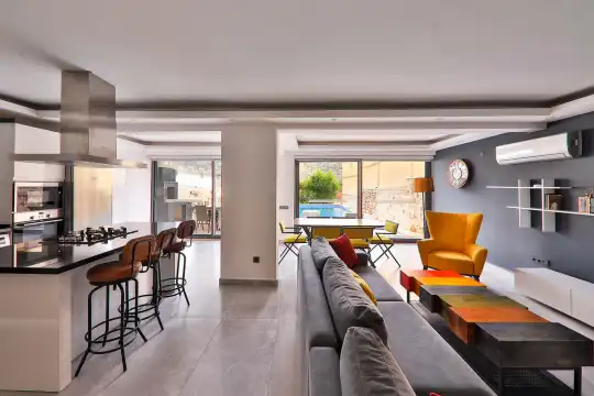 Salonumuzda rahat, kaliteli, lüks oturma grubu, klima, tv ve uydu alıcısı, ütü masası, sınırsız kablosuz internet, havuz başına ve bahçeye çıkış vardır.