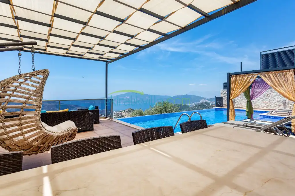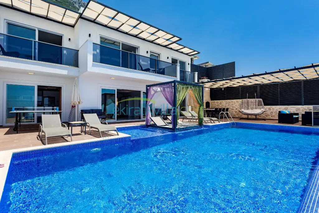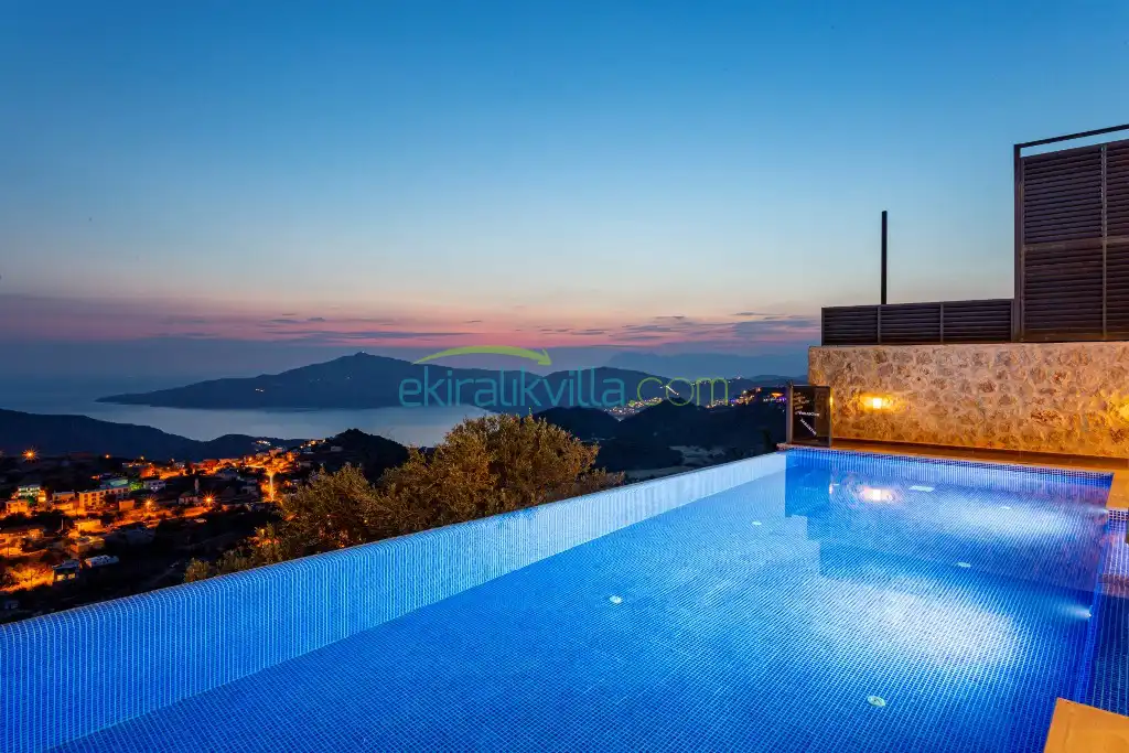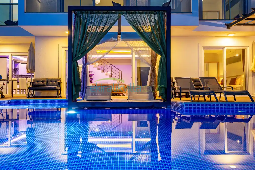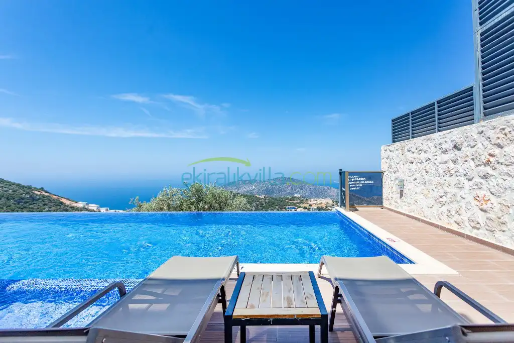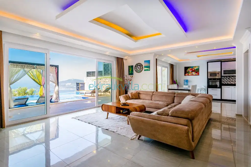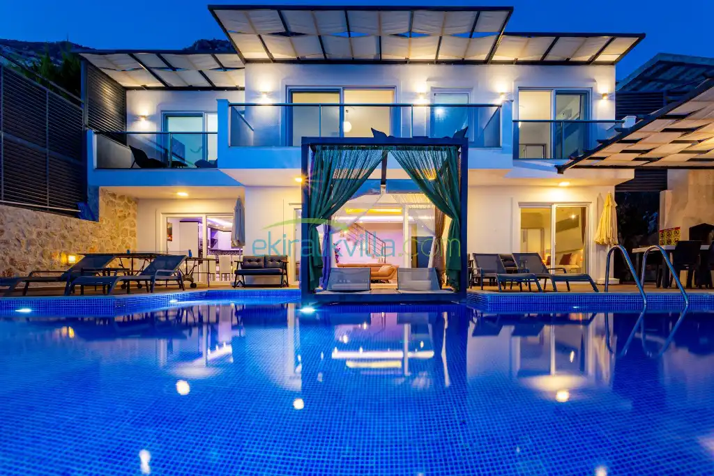 Kalkan Günlük Kiralık Villamızın içerisinde kaliteli, modern ve lüks eşyalar ile özenle dekore edilmiş olup, kalkan yazlık tatil evimiz kalkan merkeze 15 dakika araba mesafesinde olup en yakın market gibi tesislerede sadece 5 dakika araba ile sürüş mesafesinde yer alan kalkan elit villalarımızdandır.