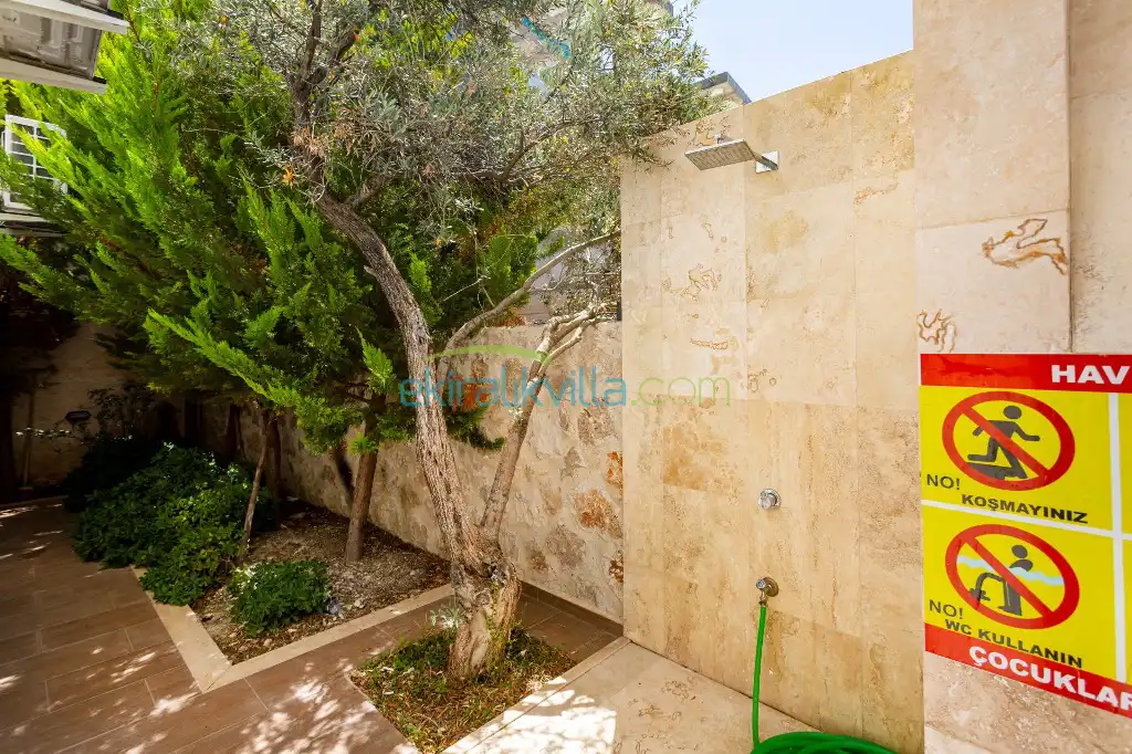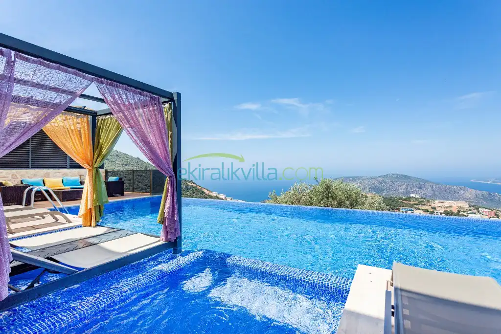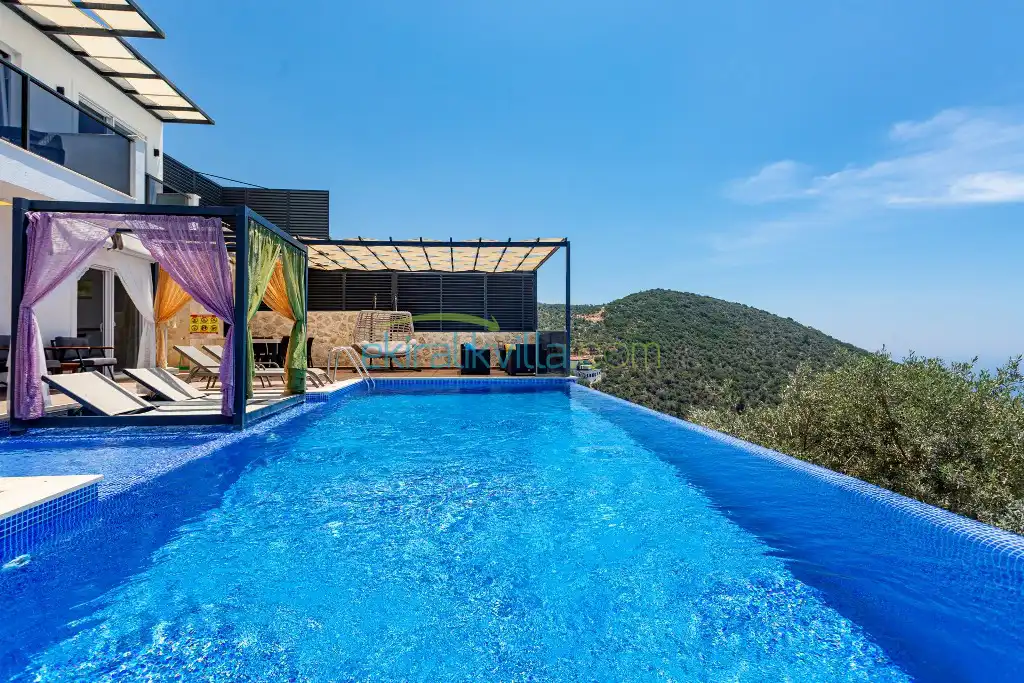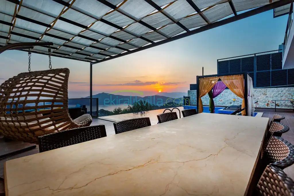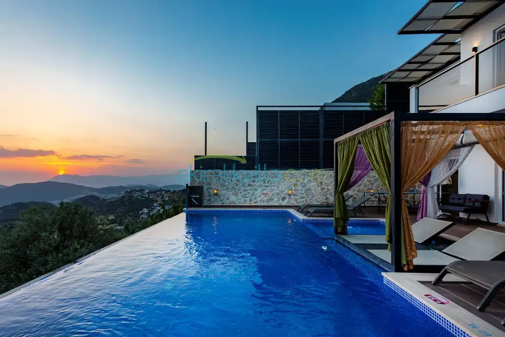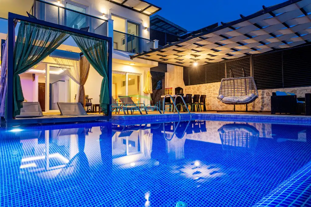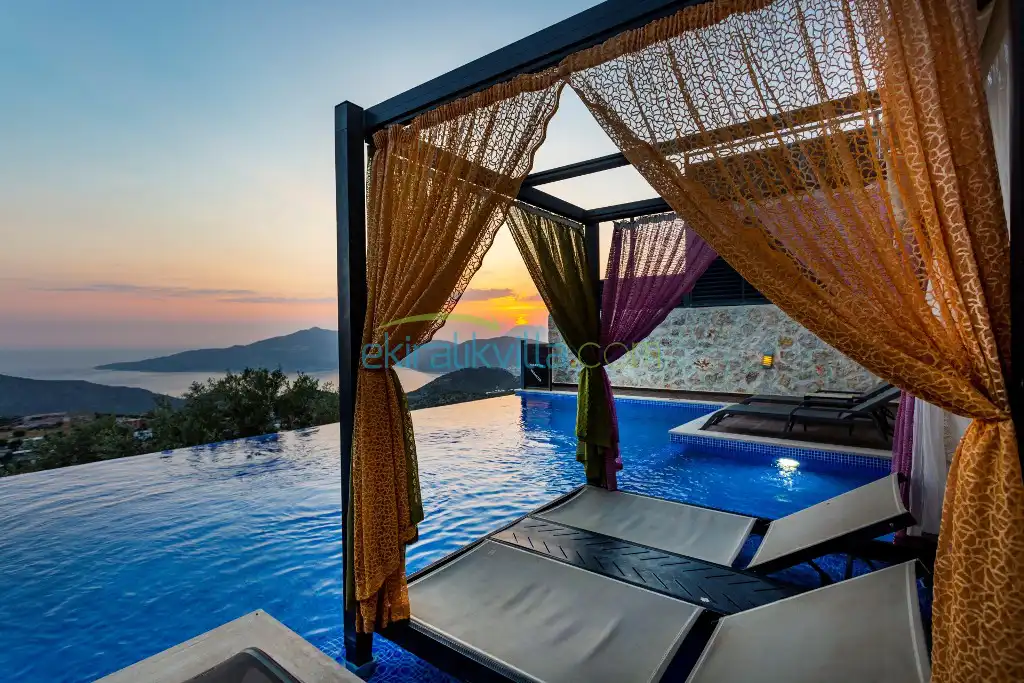 Kalkan Günlük Kiralık Villamızın içerisinde kaliteli, modern ve lüks eşyalar ile özenle dekore edilmiş olup, kalkan yazlık tatil evimiz kalkan merkeze 15 dakika araba mesafesinde olup en yakın market gibi tesislerede sadece 5 dakika araba ile sürüş mesafesinde yer alan kalkan elit villalarımızdandır.