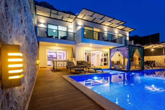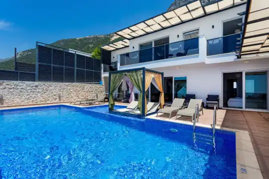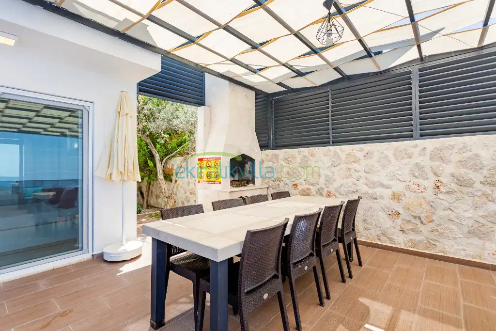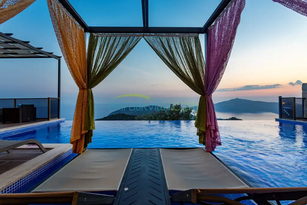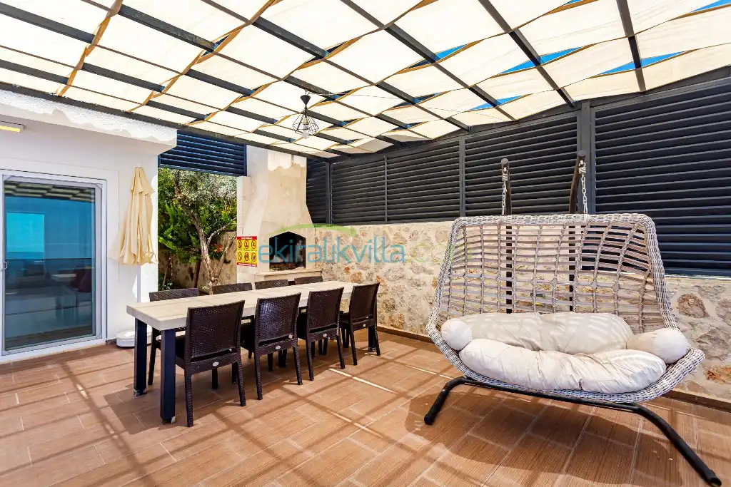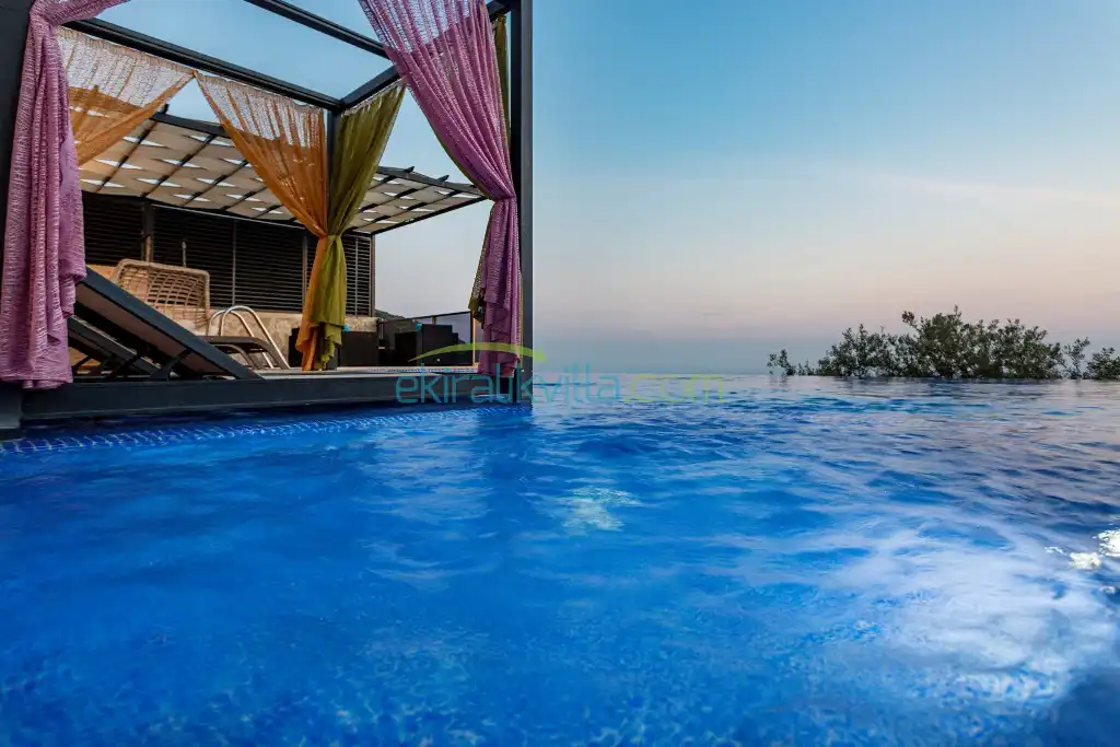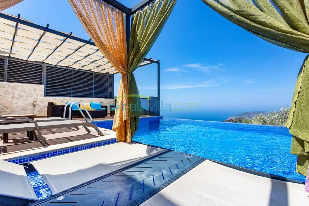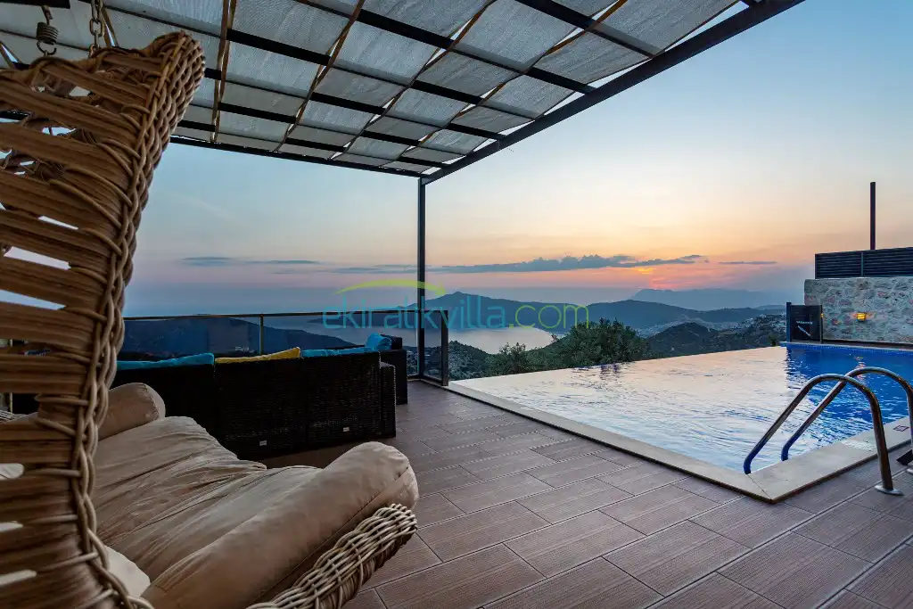 Kalkan Günlük Kiralık Villamızın içerisinde kaliteli, modern ve lüks eşyalar ile özenle dekore edilmiş olup, kalkan yazlık tatil evimiz kalkan merkeze 15 dakika araba mesafesinde olup en yakın market gibi tesislerede sadece 5 dakika araba ile sürüş mesafesinde yer alan kalkan elit villalarımızdandır.