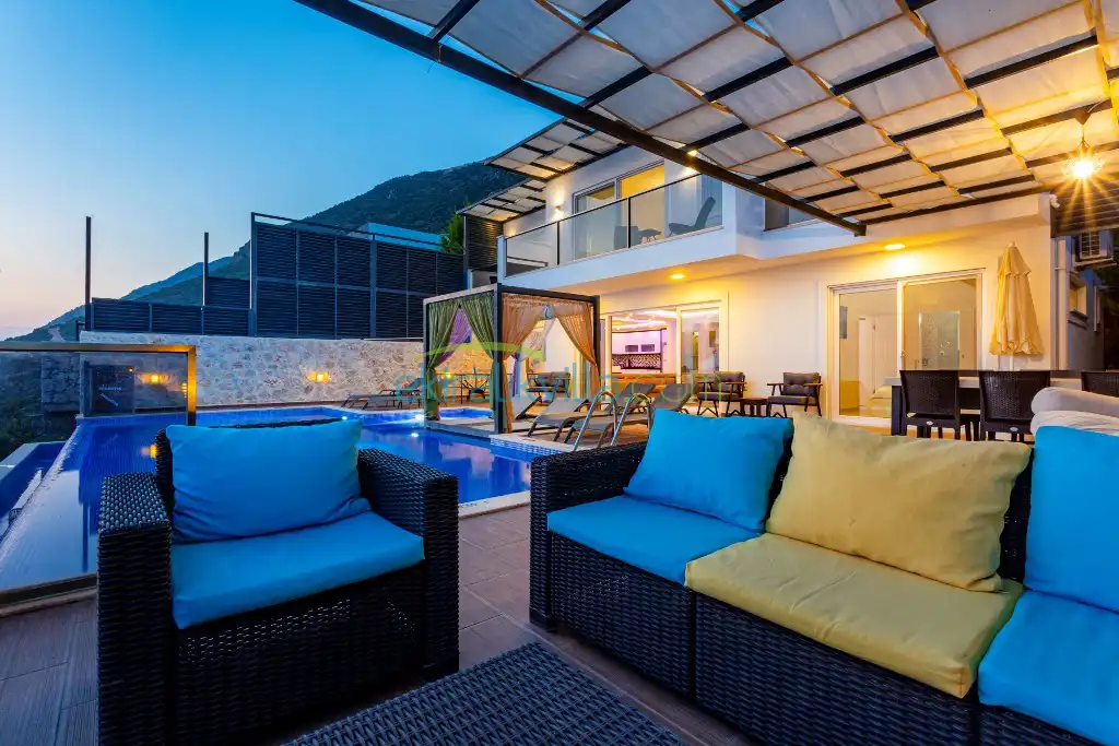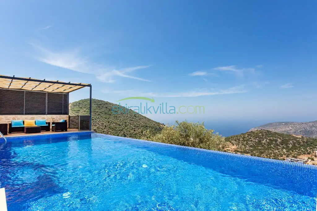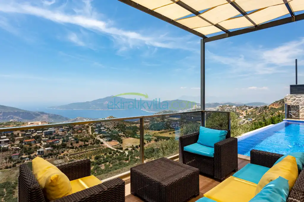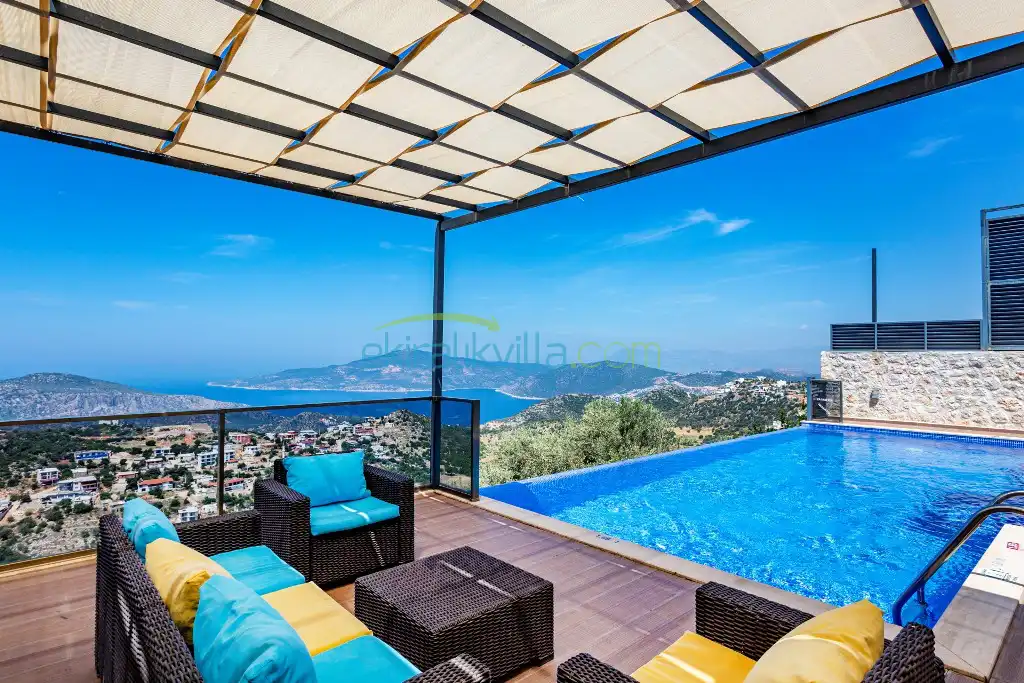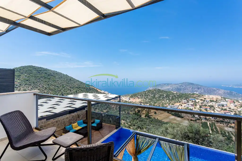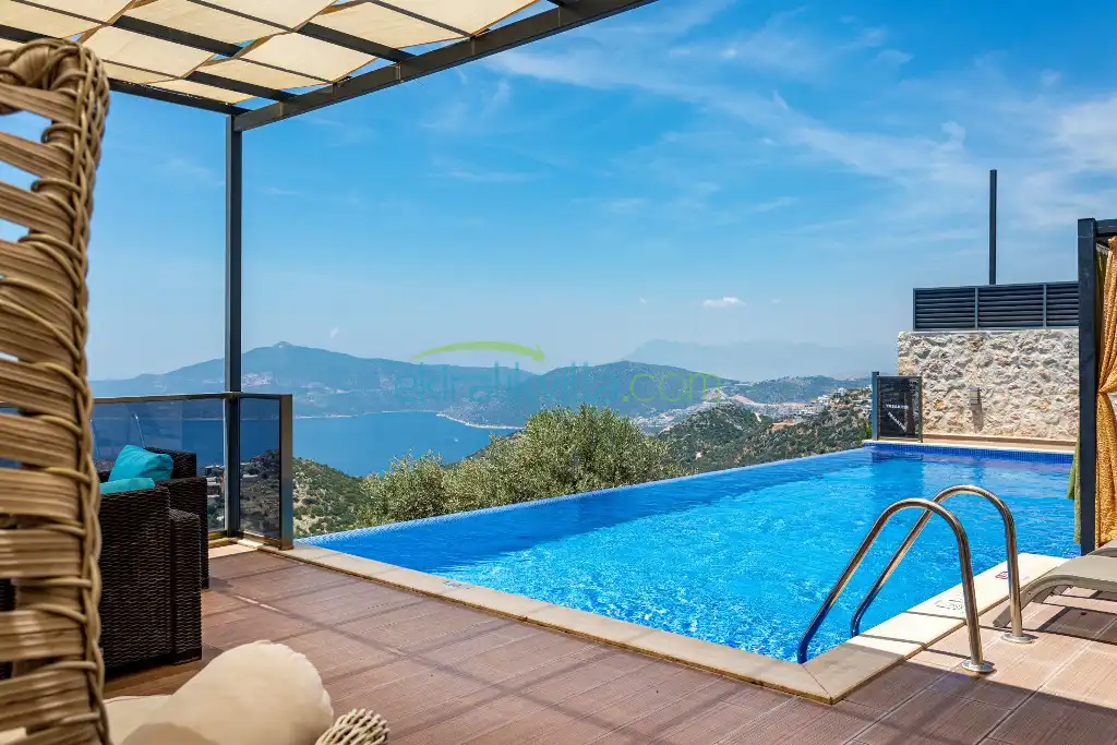 Panoramik kalkan ve deniz manzaralı, Geniş aile villası, Lüks iç ve dış dekorasyon, Sakin bir konum, Havuz terasında barbekü, Jakuzili Villa, Kalkan Merkeze ve Denizine 15 dakika Villa konumda bulunan kiralık villa ve yazlıklar,