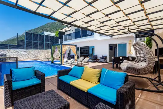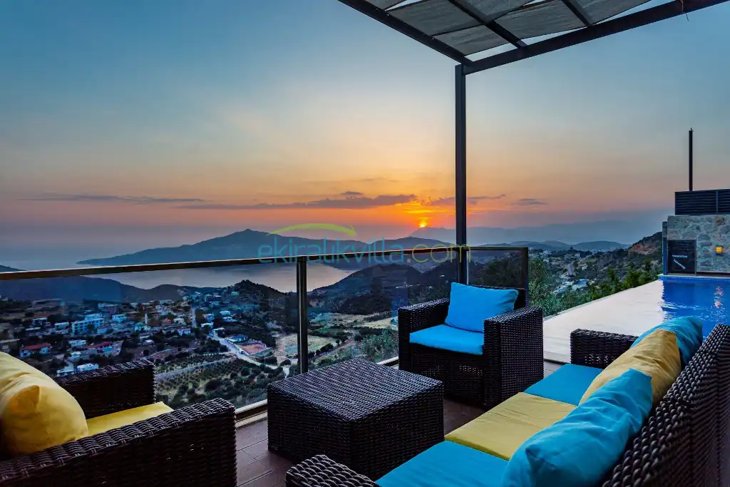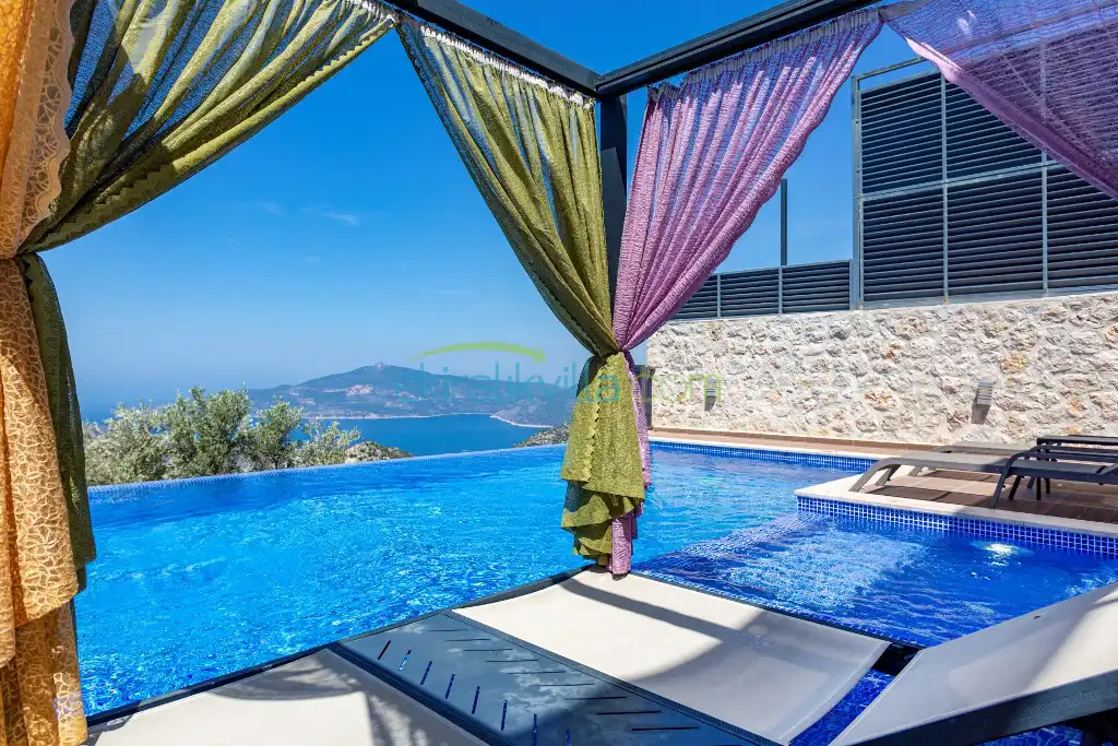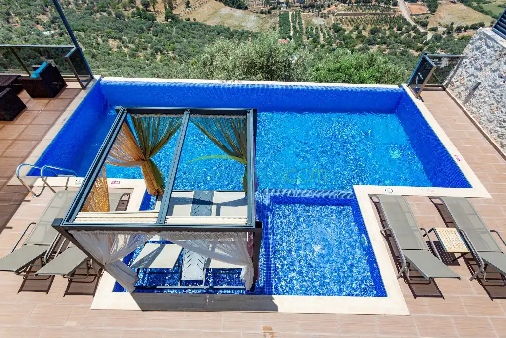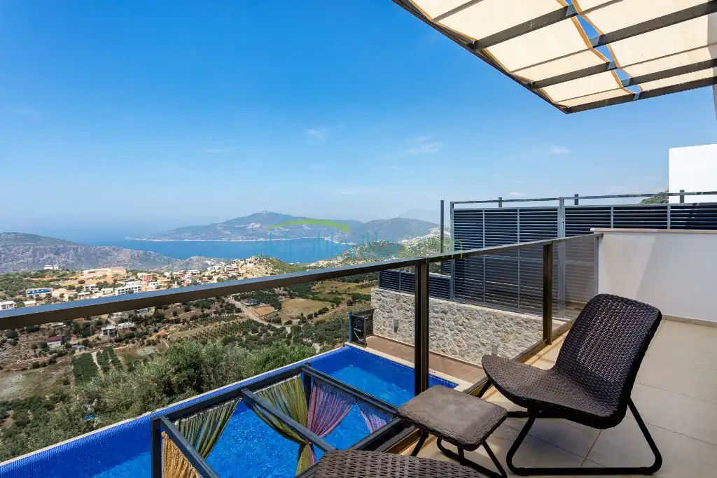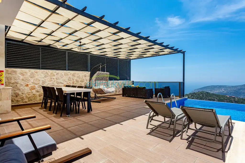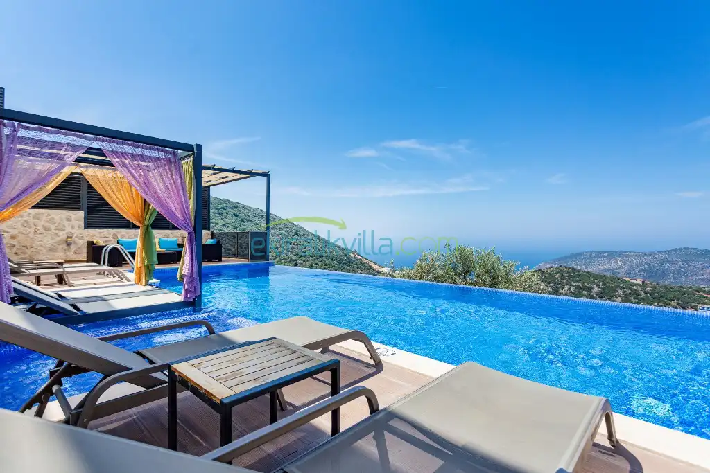 Panoramik kalkan ve deniz manzaralı, Geniş aile villası, Lüks iç ve dış dekorasyon, Sakin bir konum, Havuz terasında barbekü, Jakuzili Villa, Kalkan Merkeze ve Denizine 15 dakika Villa konumda bulunan kiralık villa ve yazlıklar,