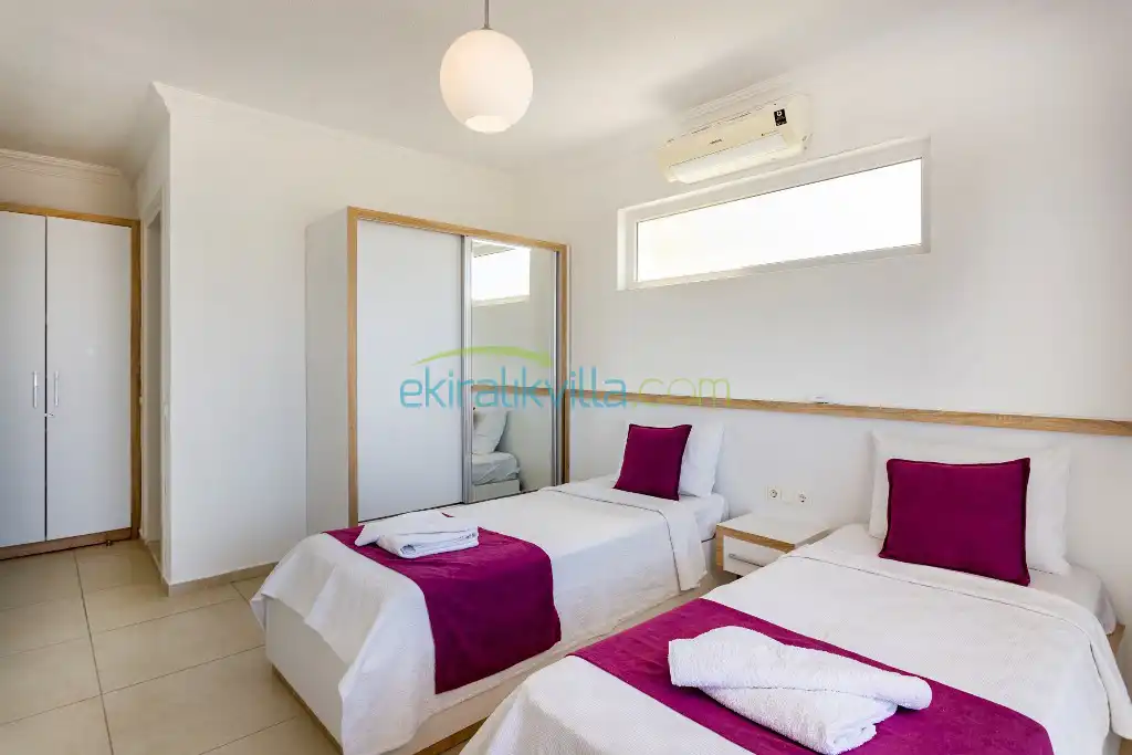 3. Yatak odası: 2 adet tek kişilik yatak, elbise dolabı, saç kurutma makinası, klima, balkon, banyo ve tuvalet bulunmaktadır. Balkon ve Deniz manzarası mevcuttur.