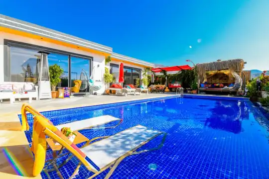 Kaş Kiralık Balayı Villası'nın yüzme havuzu korunaklı olup, dışarıdan kesinlikle gözükmemektedir ve bu sebeple dolayı Villa Renk muhafazakar villa tatili isteyen aile ve balayı çiftlerimiz için oldukça şık bir çayköy kiralık helal villamızdır.
