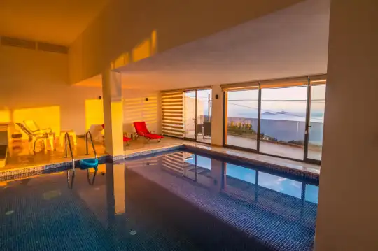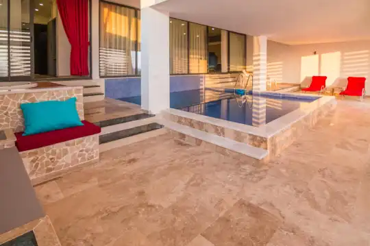 Kalkan özel kiralık villamızda deniz manzarasına karşı  Kapalı Yüzme Havuzu mevcut olup kusursuz bir şekilde keyfinizi çıkarabilirsiniz. Kiralık Tatil Evimizi lüks ve modern villa, havuz terasında oturma grubu, şezlong ve balkon kısmında barbekü, yemek masası, özel otopark gibi ve en ince ayrıntısına kadar düşünülmüş olup özgürce tatlinizi yapabilirsiniz