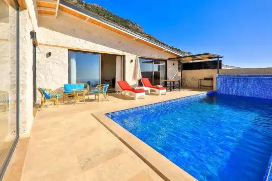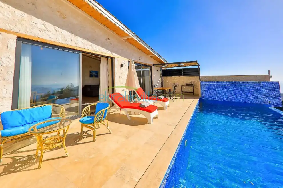 Kalkan özel kiralık villamızda deniz manzarasına karşı Özel Yüzme Havuzu mevcut olup kusursuz bir şekilde keyfinizi çıkarabilirsiniz. Kiralık Tatil Evimizi lüks ve modern taş mimari yapıya sahip, havuz terasında oturma grubu, şezlong ve güneşlenme şemsiyesi, barbekü gibi ve en ince ayrıntısına kadar düşünülmüş olup özgürce tatlinizi yapabilirsiniz