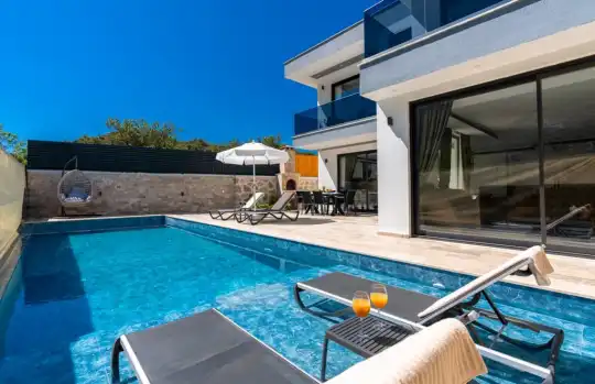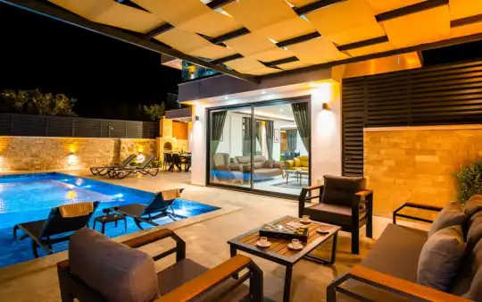 Tatil aile villası, Lüks iç ve dış dekorasyon, Sakin bir konum, Havuz terasında taştan barbekü, Jakuzili özel tatil villası, Kalkan merkeze ve denizine yakın konumda bulunan kiralık villa ve yazlıklar, Kalkan günlük kiralık lüks tatil evi. Kalkan muhafazakar villa